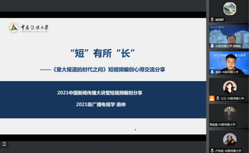 12月22日,来自中国传媒大学的六名编创同学继续围绕“中国新闻传播大讲堂”系列课程的短视频制作,进一步展开精彩生动的分享。李超鹏同学用细致生动的语言将短视频编创背后的过程一一铺展开来,启发同学们在创作过程中要重视积累、精益求精,从而不断提高自身的创作水平。卢肖依同学介绍了新华社记者周科主讲课程《共鸣、共情、共振——以“春运母亲”报道为例》,从制作基础、内容、节奏、讲述风格等多个维度对比长、短视频创作的不同,展现了她对短视频编创的独特思考。曲伸同学提出“控制节奏、控制叙事、巧用情绪、注重网感”几个可落地、可实操的技巧,鼓励同学们日后积极参与短视频编创的实践。常能嘉同学结合2021年“中国新闻传播大讲堂”主讲嘉宾柴红芳老师的讲授内容,从重构、善用素材、新媒体特征三个维度向同学们讲解了精编大讲堂短视频的编创过程,强调只有用好、用对素材,才能够让短视频的内容制作“容光焕发”。朱娜同学以“在全媒体时代如何放大舆论监督的正面传播价值”为主题,全面生动地展现了她在视频制作过程对编辑创作、网感积累、后期思维培养及团队合作方面的实践感悟。任艾同学首先带领大家回顾了新华社记者侯雪静的大讲堂课程《做记者,更要做新时代的记录者和阐释者》,生动展示了脱贫攻坚战中的一系列伟大成就,以及如何做一个好记者,记录时代的伟大变迁。
